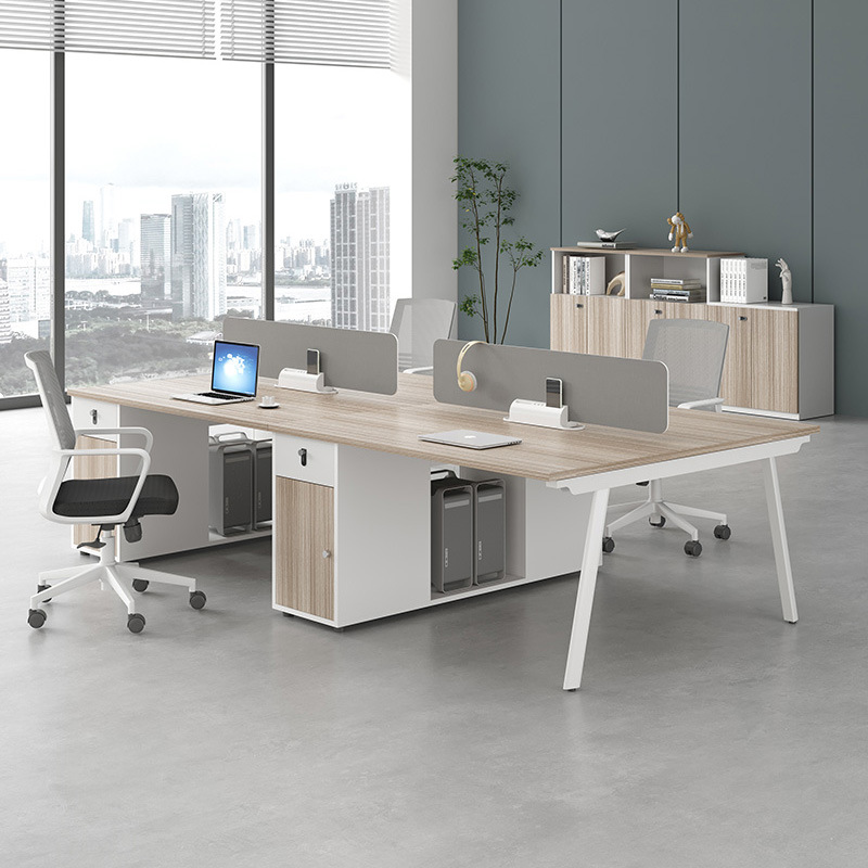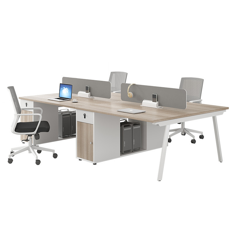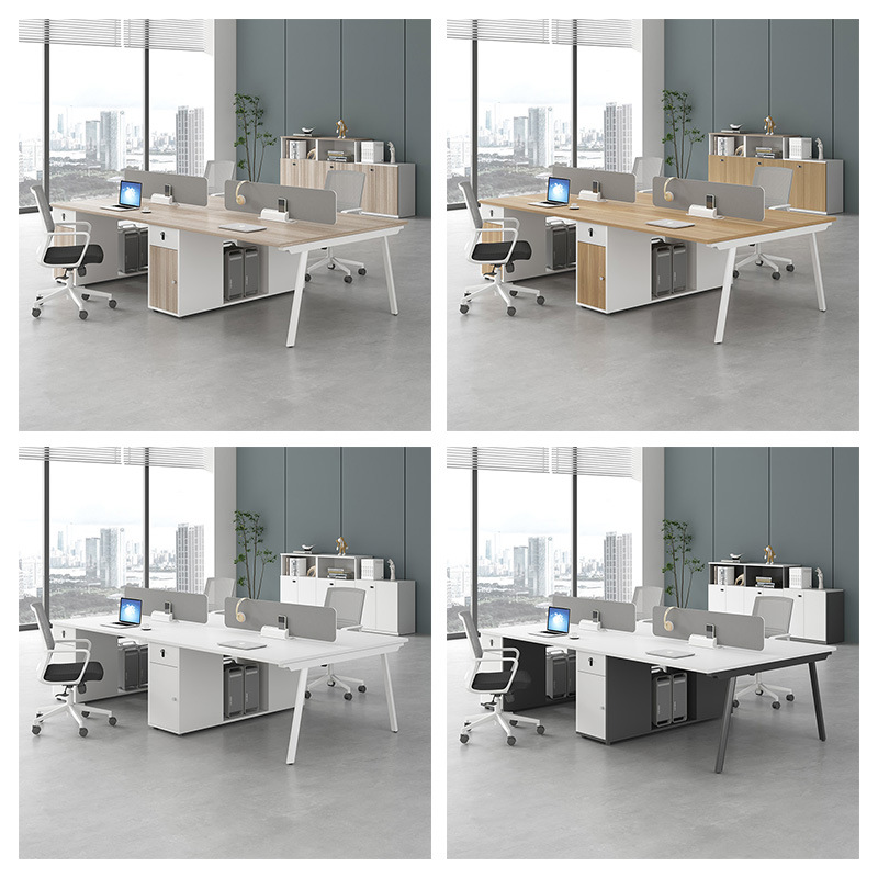 This is a modern and functional office desk setup that provides individual workspaces for four people while promoting team interaction.